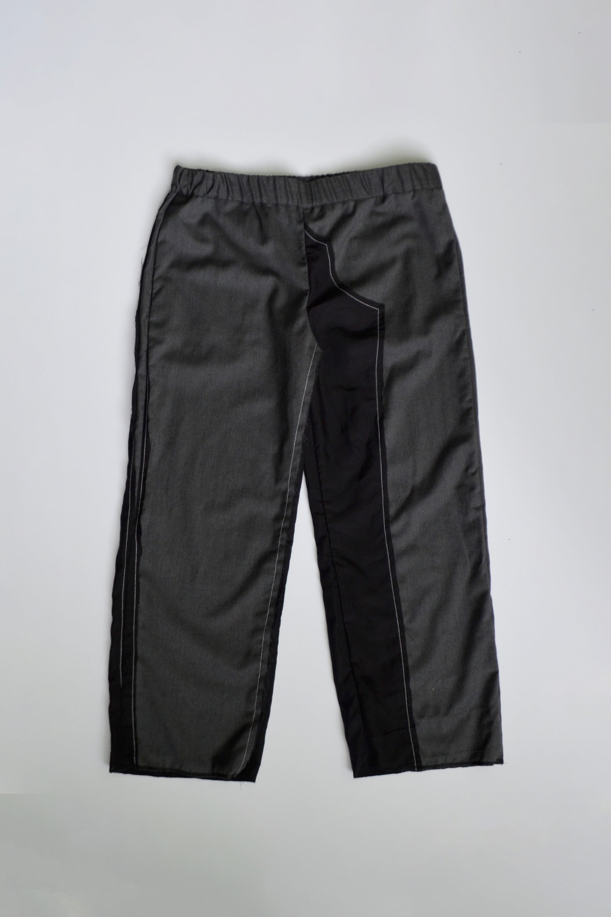 The alex pant is a mid-rise, straight-leg trouser featuring a 2-inch elastic waistband, two hidden side-seam pockets, and a serged hem. Each pair is uniquely crafted from three secondhand trousers in a mix of dark tones - blacks, grays, and blues, pieced together with contrasting white stitching to form a distinctive patchworked surface. The result is a one-of-a-kind garment that blends the quiet elegance of the ’90s with a distinctly deconstructed aesthetic.