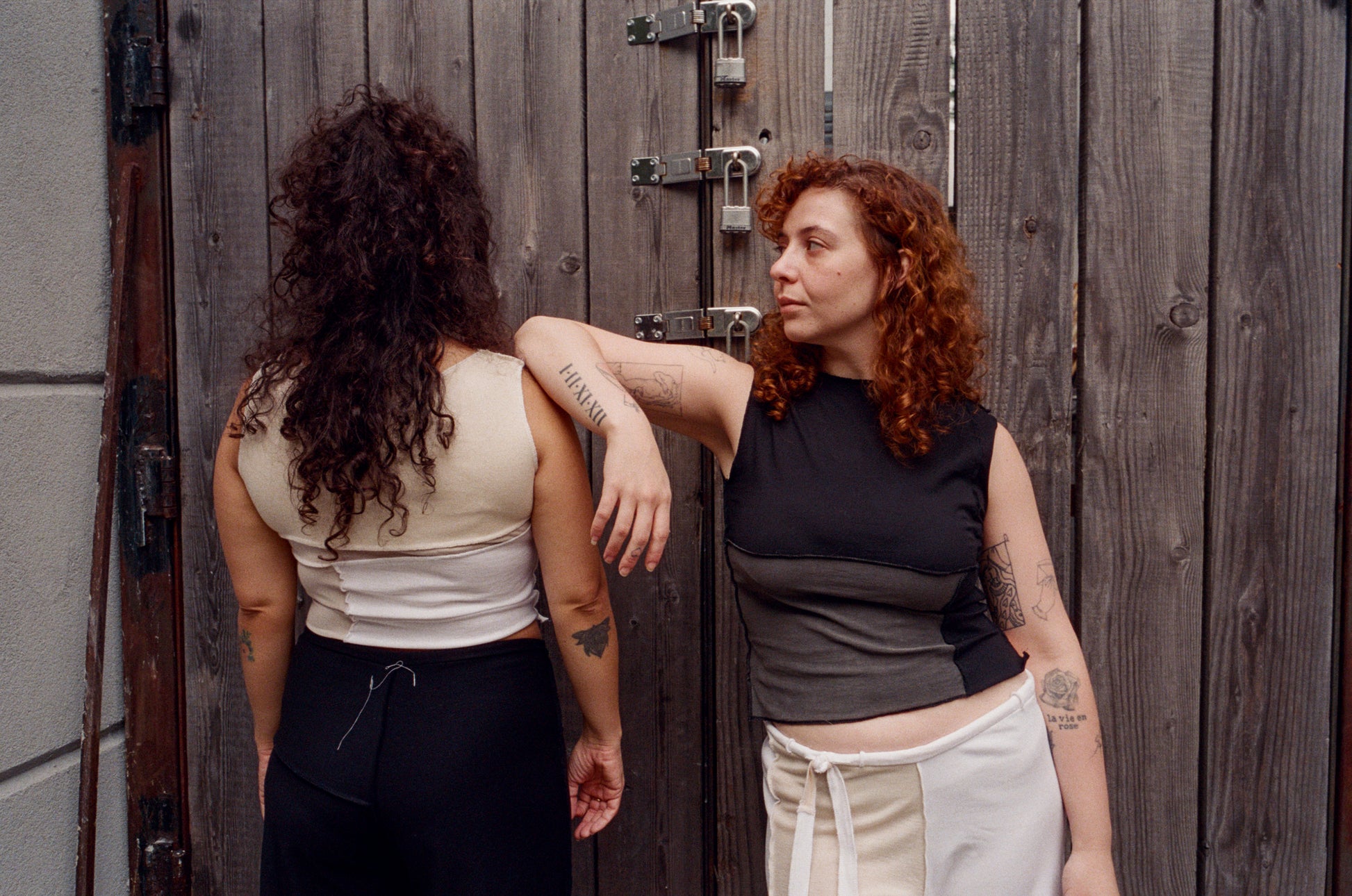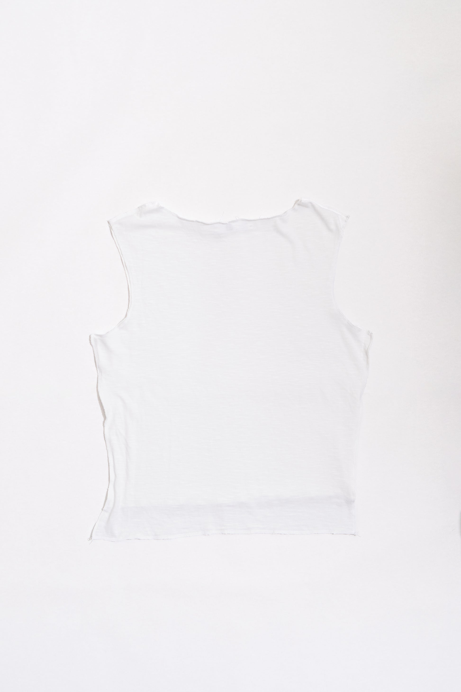 The box tank features a wide neckline and a front hem that extends 2” longer than the back, designed to complement lower-rise bottoms. Each piece is thoughtfully constructed from discarded factory off-cuts - an eclectic mix of lightweight knit fabrics, stitched together with exposed serger seams. The raw aesthetic is carried throughout the design, with all construction and finishings seams left exposed - making the tank both rough and delicate.