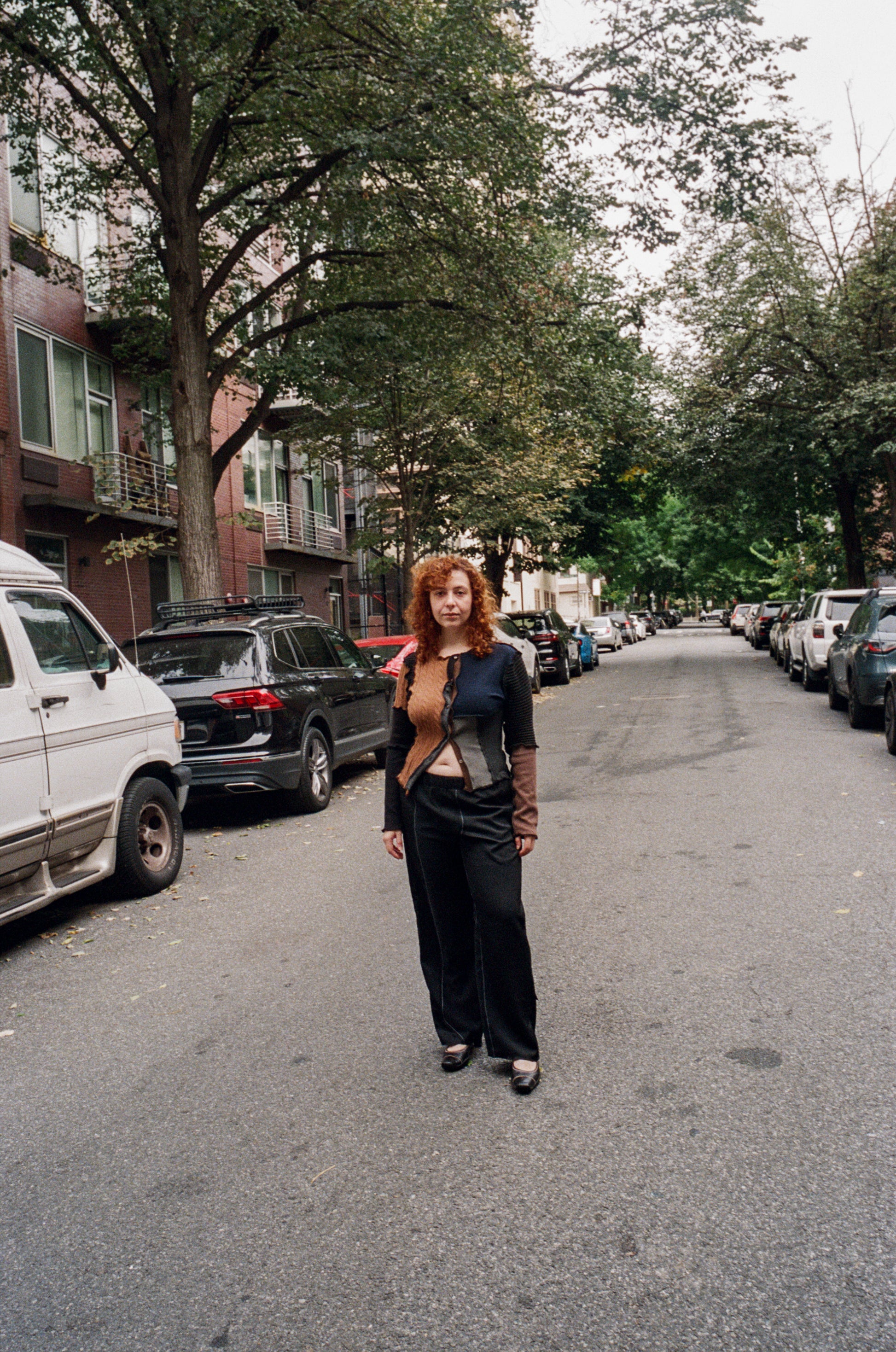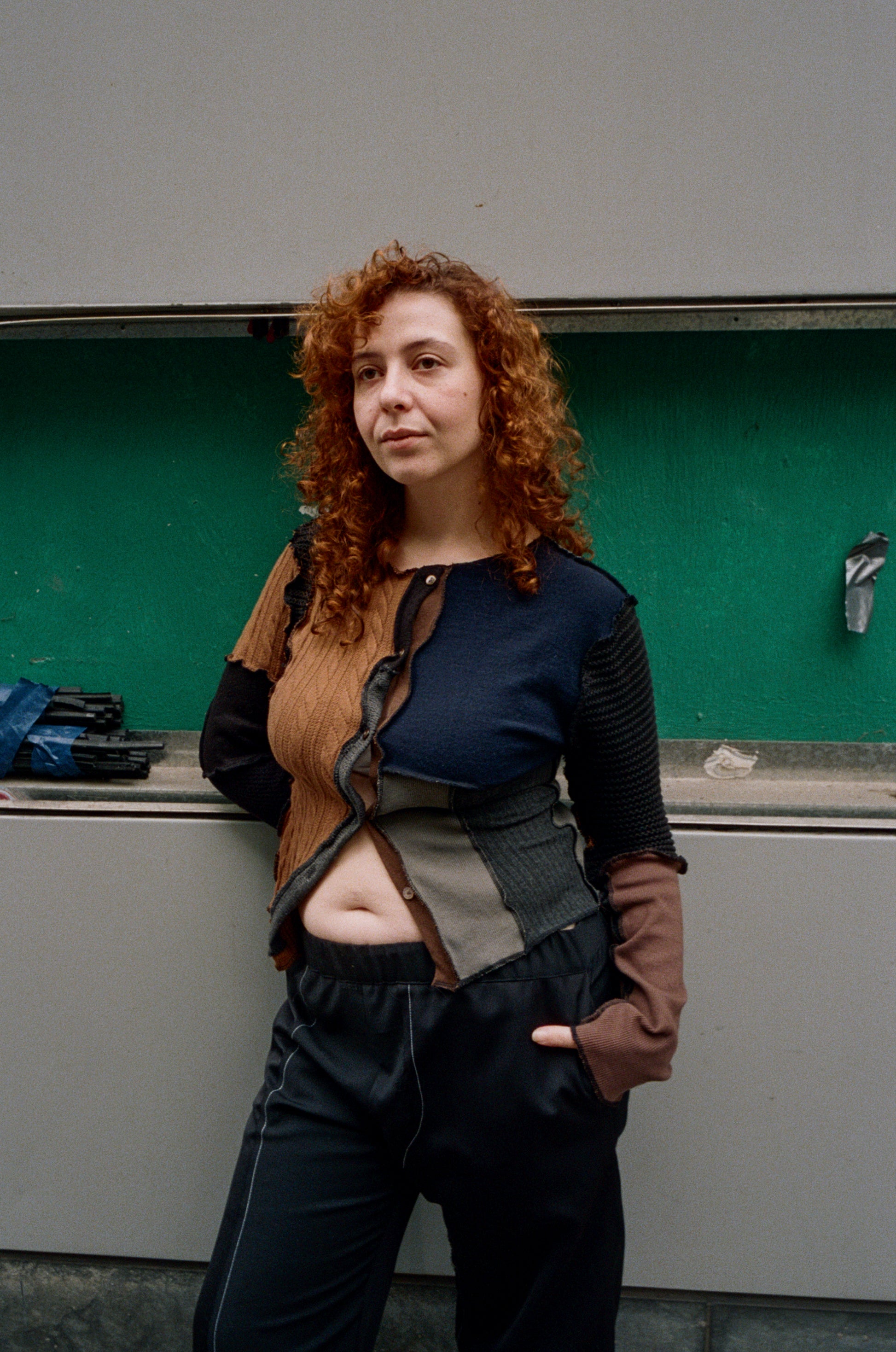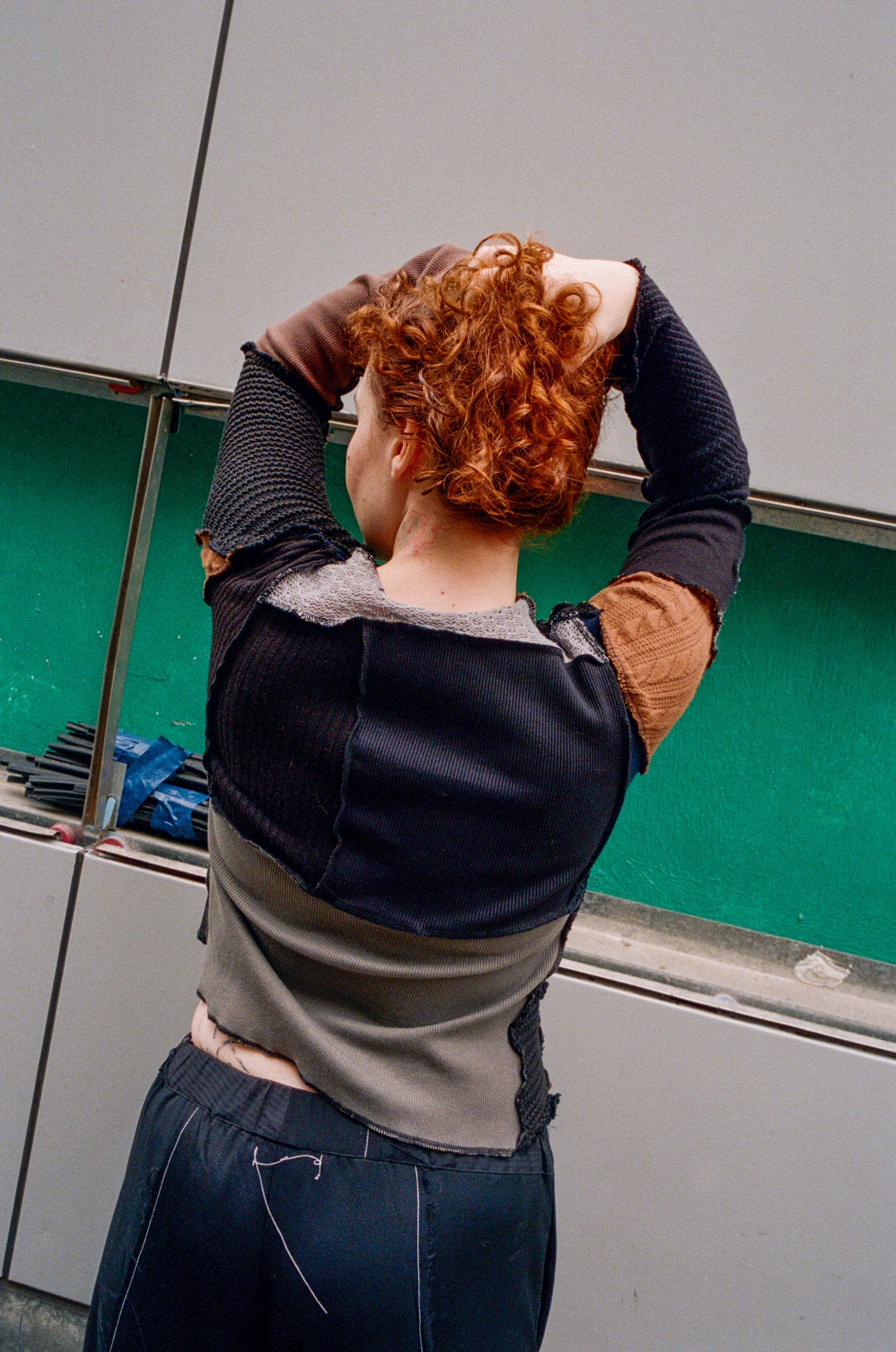 The Cardigan is crafted from secondhand sweaters in deep, moody tones, each piece is a one-of-a-kind blend of dark colors, varied textures, and mixed materials. All finishings feature exposed serger stitching, highlighting the garment’s raw, deconstructed aesthetic. The buttons are also reclaimed, resulting in a unique combination of dark-toned buttons on every cardigan.