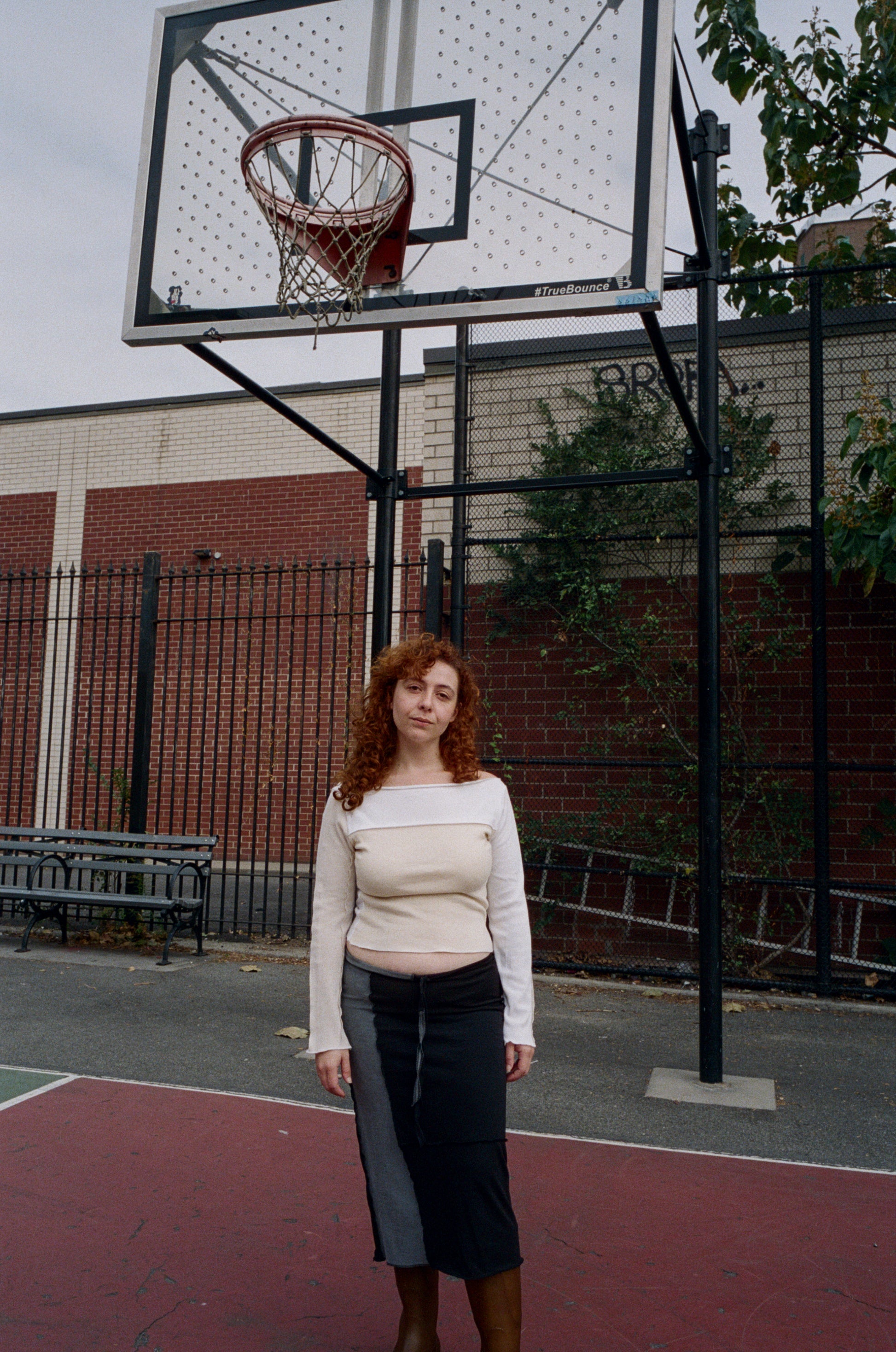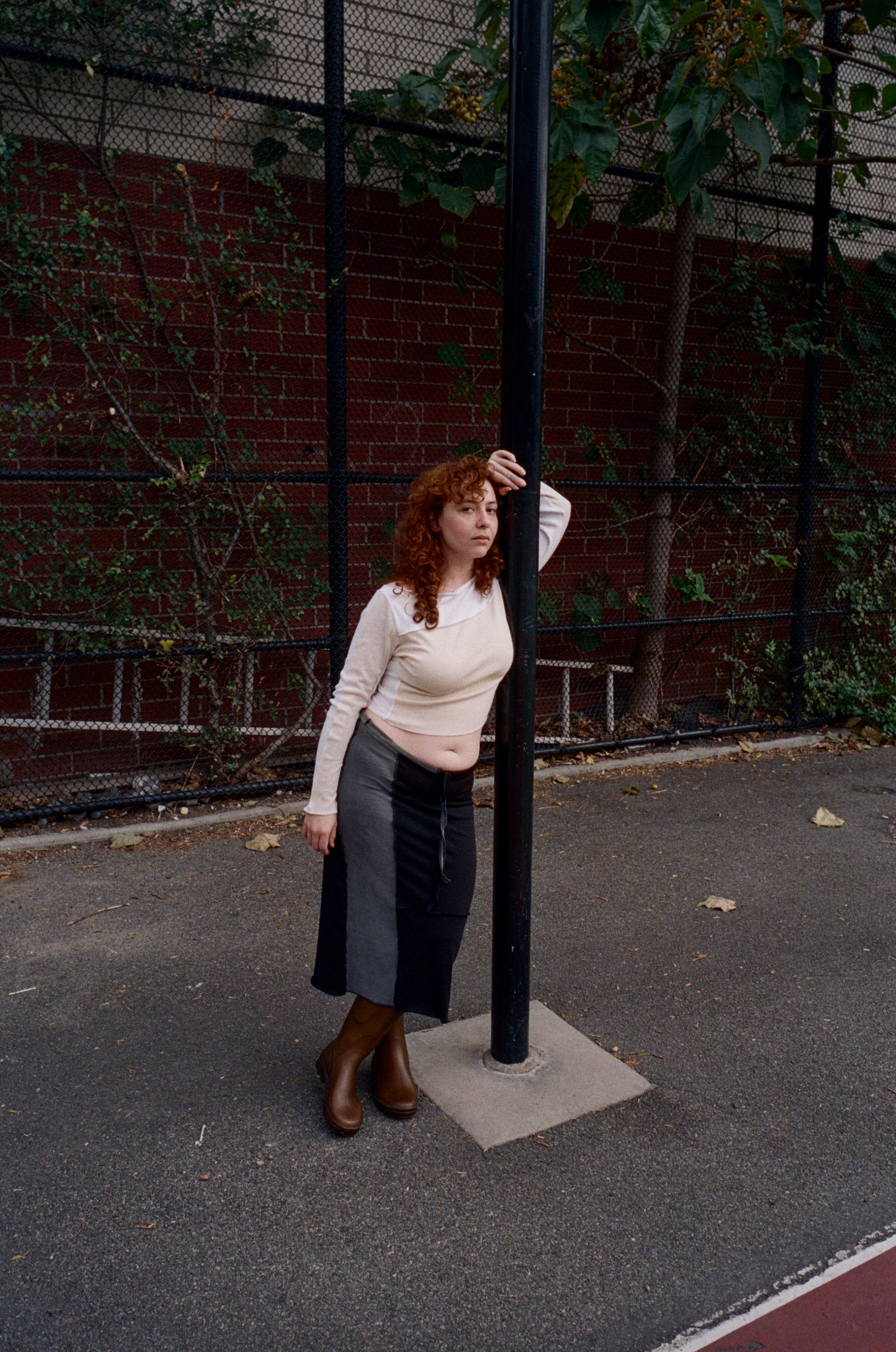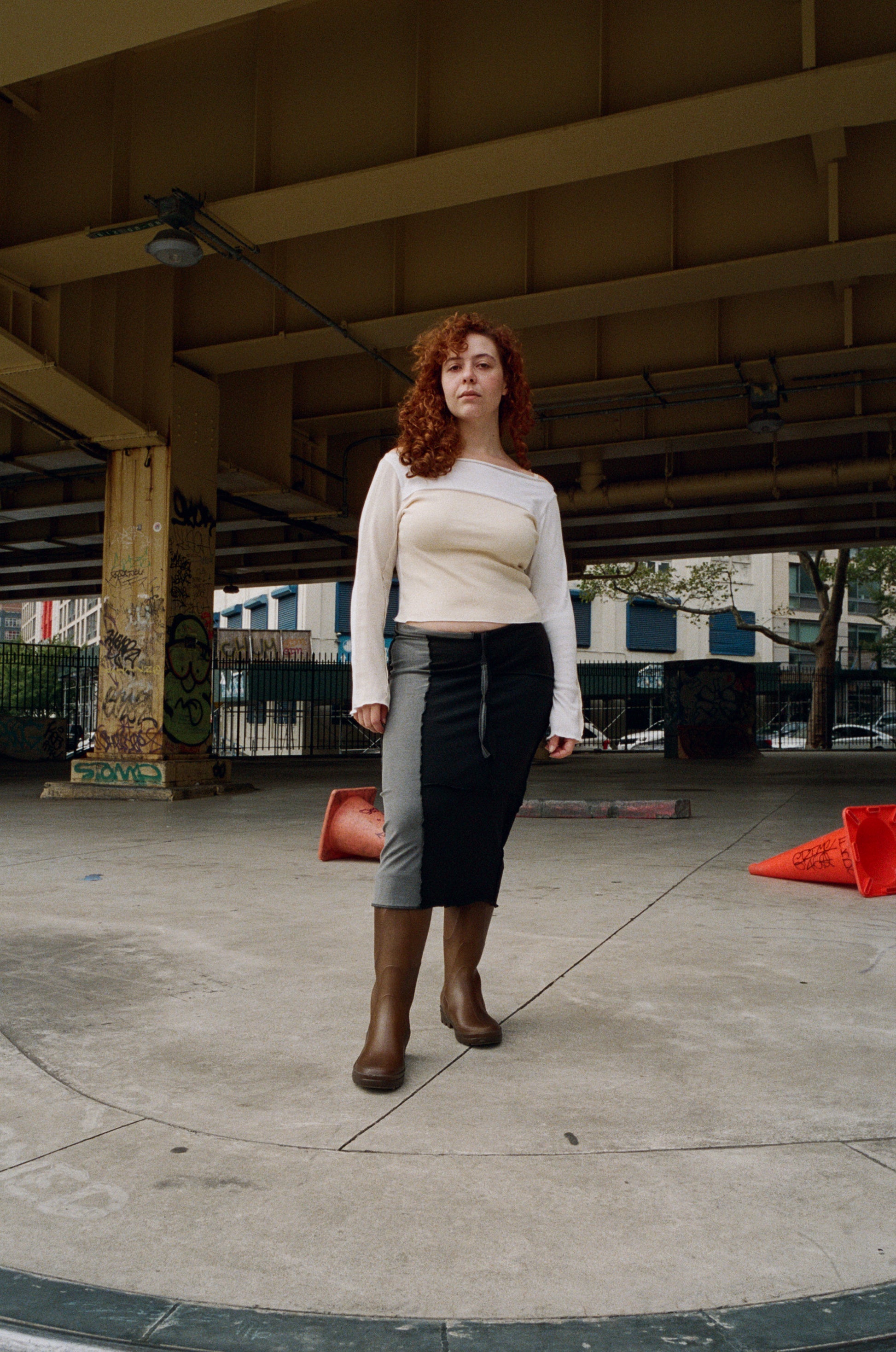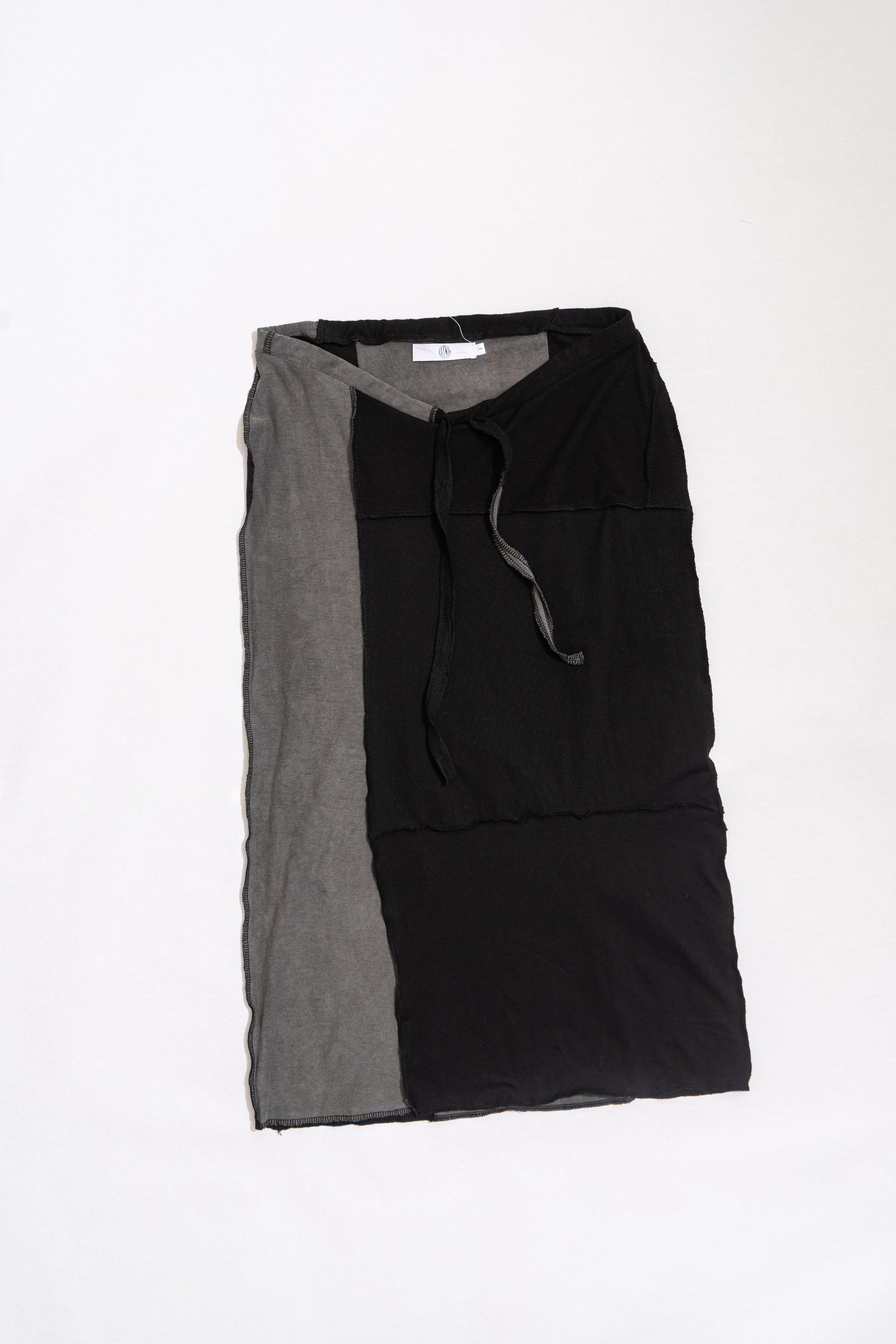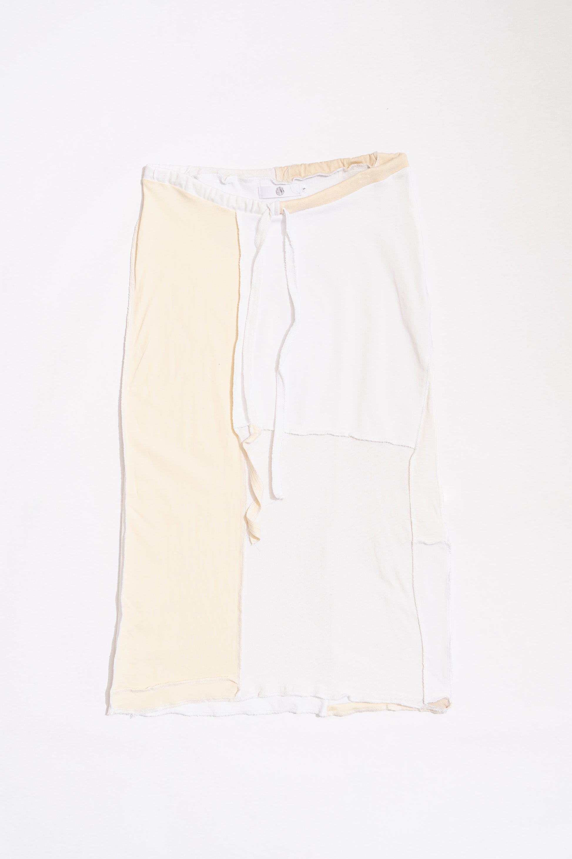 The low font skirt is a midi-length, straight-cut piece designed with a 2-inch difference between the front and back waist - creating a flattering, low-rise effect in the front and the comfort of a high-rise fit in the back. An adjustable drawstring sits at center front, accented by exposed serger seams. For added versatility, the skirt can be rotated sideways to create an asymmetrical, high-low silhouette. Each piece is patchworked from lightweight, upcycled knit fabrics and finished with visible serger seams.