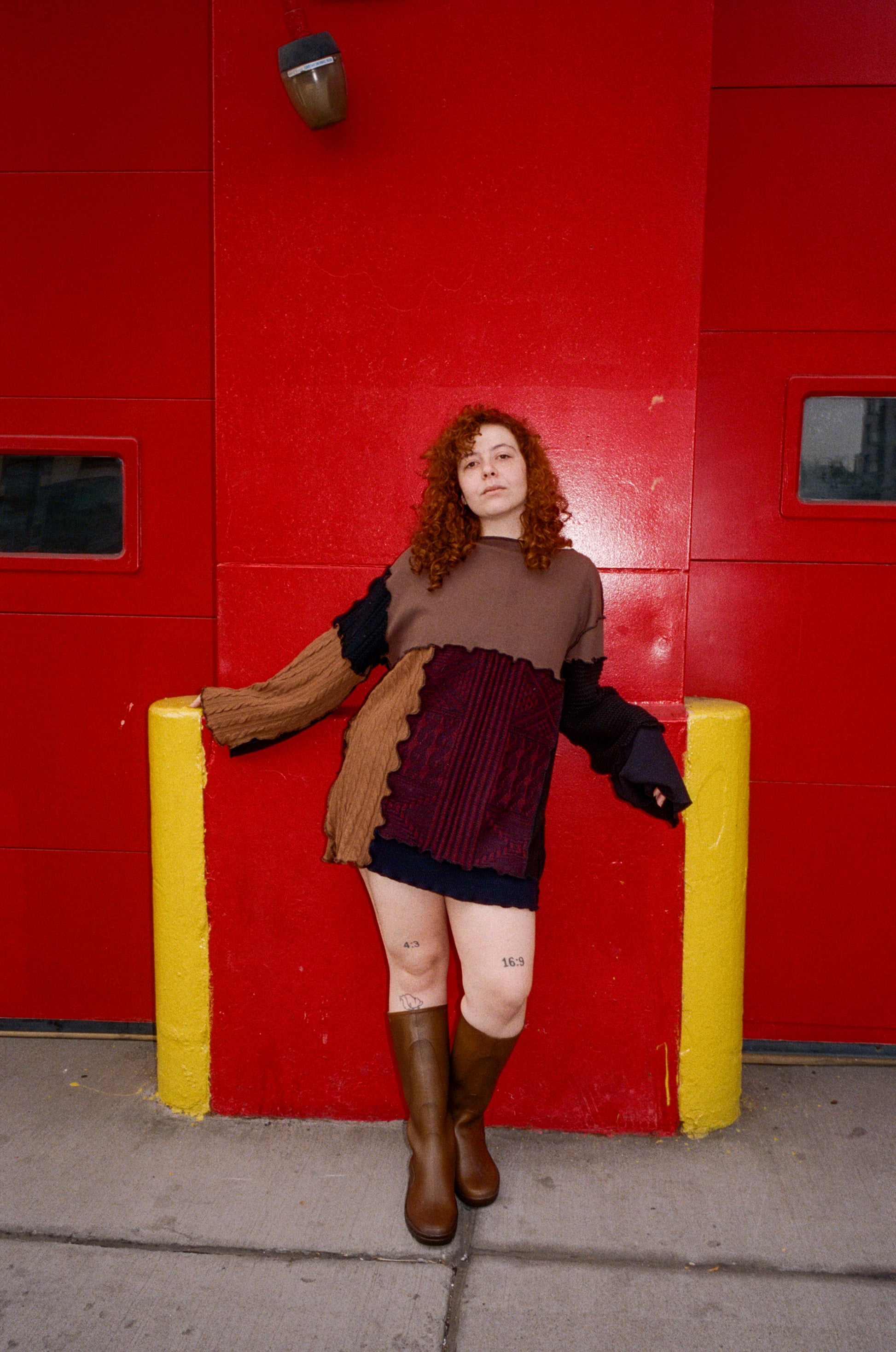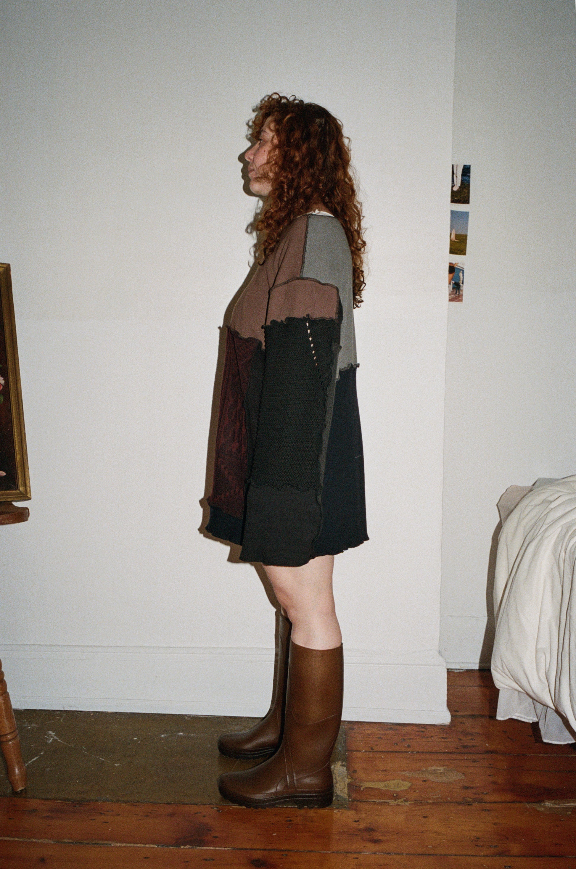 The os sweater is oversized and cozy, crafted from dark-toned secondhand sweaters. It features a wide neckline, exposed serger seams, and serger-finished edges for a raw yet delicate finish. Each piece is a one-of-a-kind composition of textiles and textures, making every sweater unique.
