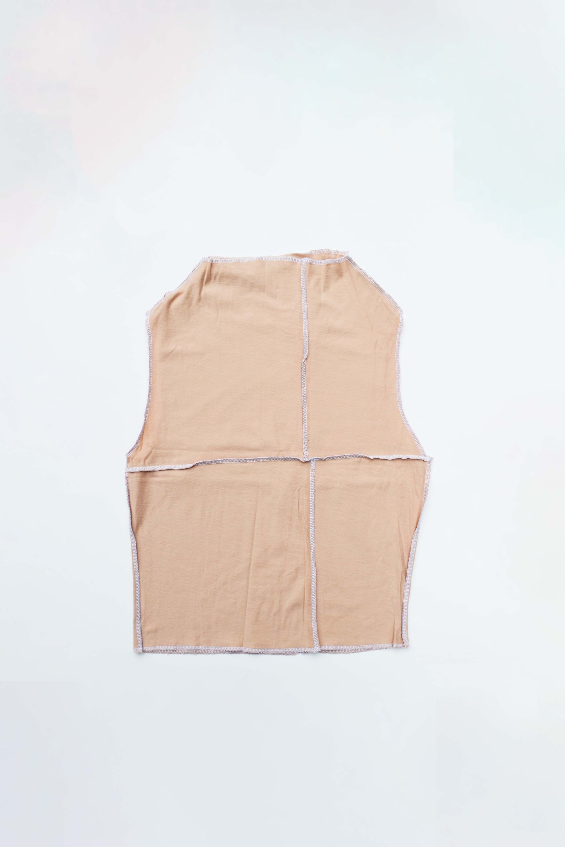 The draped-neck tank top featuring exposed overlock seams and finishings.