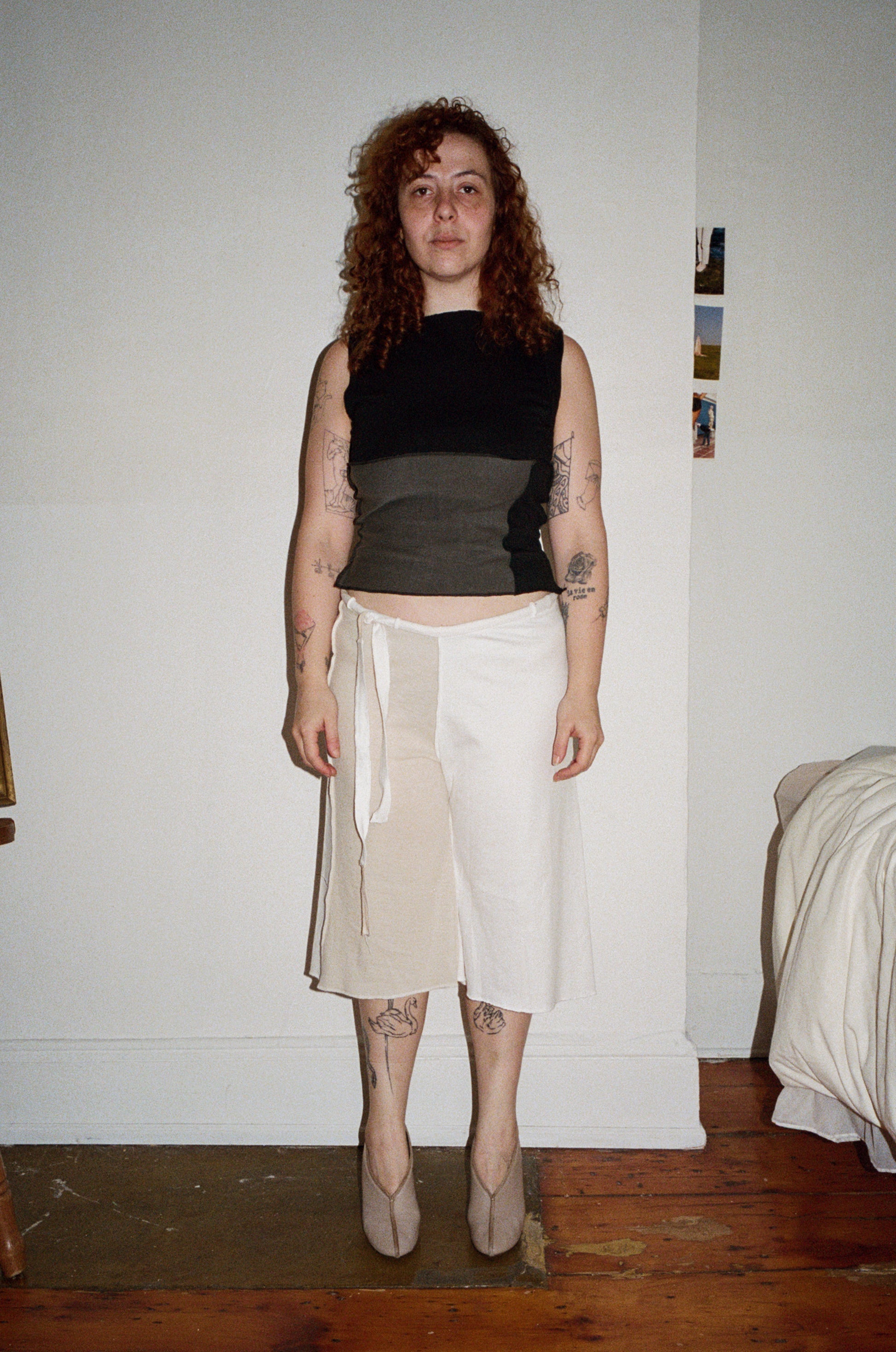 The midi pant is a flared silhouette pant with a clever dual rise: 3.5 inches lower in front for a flattering low-rise look, and higher in back for comfort and coverage. The adjustable drawstring ties just left of center front, and exposed serger seams add a raw, playful detail. Each pair is patchworked from lightweight, upcycled knits and finished with visible serger stitching throughout.